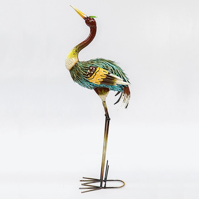This crafted and hand-painted metal heron is an outdoor decoration that will bring whimsy and colour to your space.