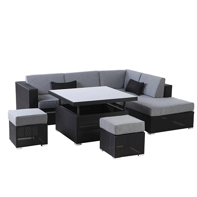 The Soho sectional set features a rust-resistant aluminum frame which makes it lightweight and easy to move. The cushions are comfortable and water-resistant. The set includes 1 lounger sofa, 1 single-arm loveseat, 2 ottomans and 1 adjustable conversation/dining table.