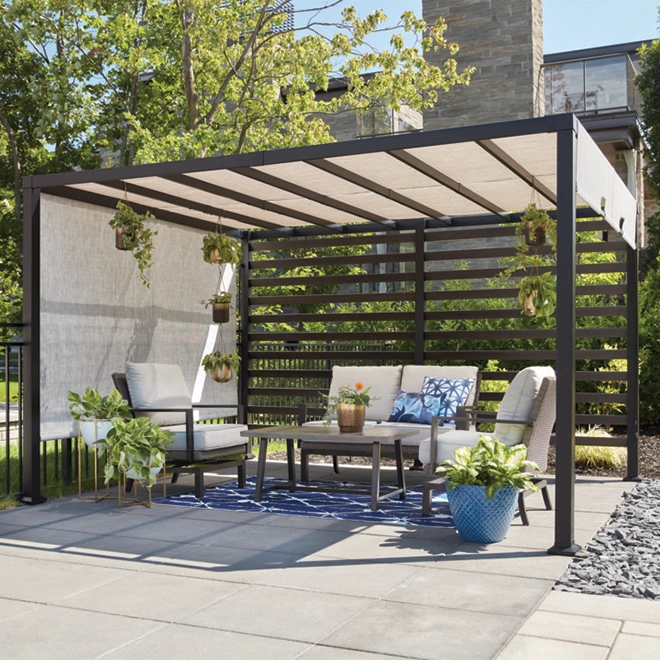Enhance your outdoor space with the Vikki pergola from Style Selection. Made of steel and aluminum, it features a 450 g sling top that can be adjusted to provide shade on both sides. The 10′ x 12′ pergola has a beautiful woodgrain colour.